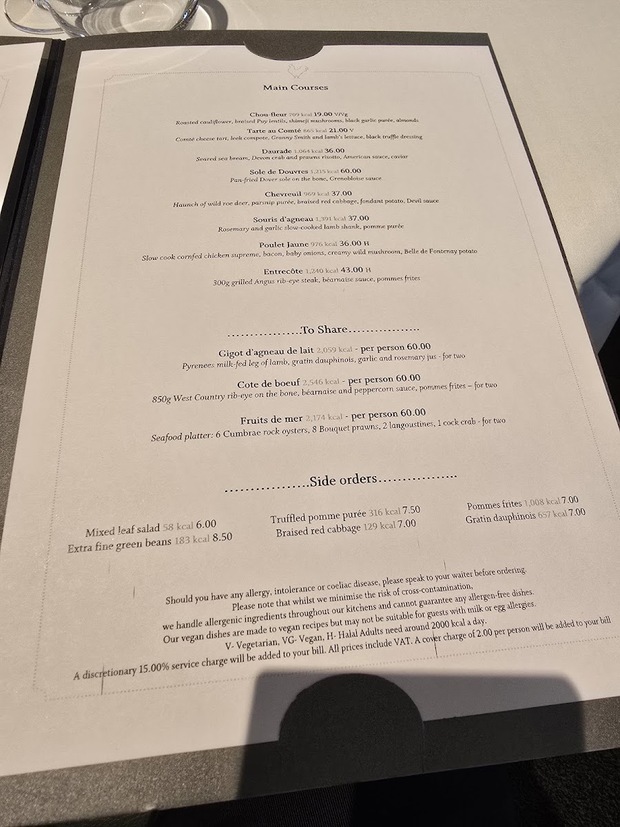 2,424 kcal - per person 850g West country Rib-eye on the bone, bearnaise and peppercorn sauce, pommes frites- for two