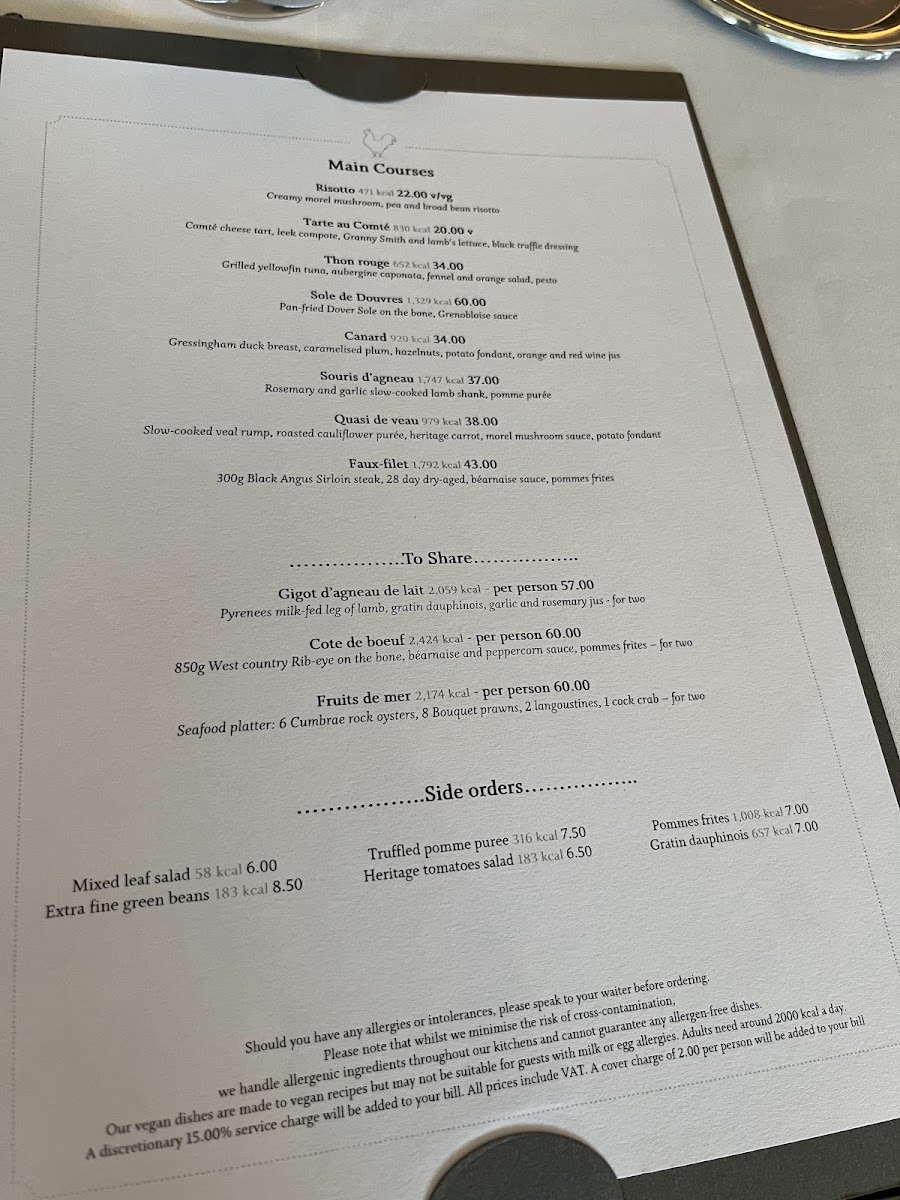 3,216 kcal - per person 8-bone English Rack of lamb, gratin dauphinois, petit pois a la francaise, garlic and rosemary jus-for two