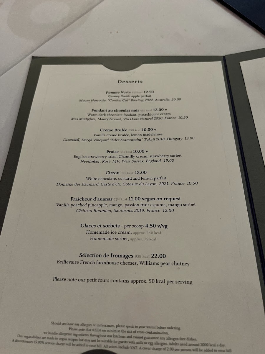 830 kcal v Comte cheese tart, leek compote, Granny Smith and lamb's lettuce, black truffle dressing